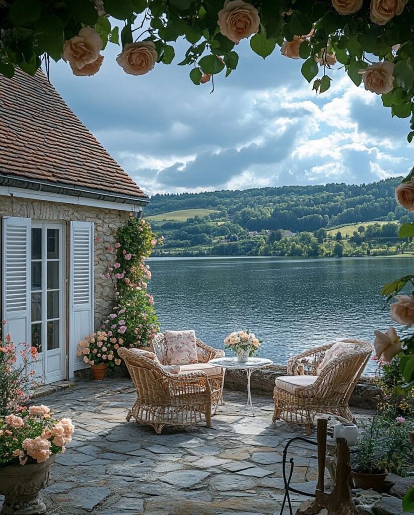 Overall, this lakeside cottage embodies the charm of rustic living at its finest. It’s a place where nature, romance, and simplicity come together to create a peaceful haven. Every detail—from the climbing roses to the serene water—makes it the perfect retreat for anyone longing for beauty, calm, and timeless countryside charm.