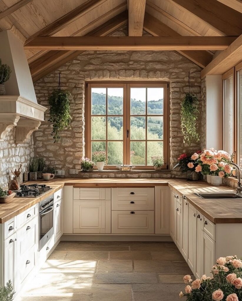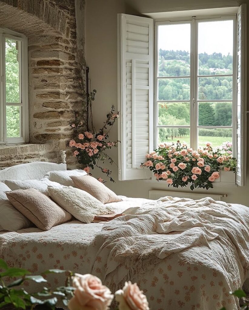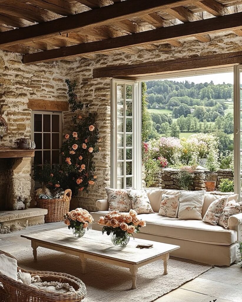 Climbing rose bushes cascade beautifully around the cottage, framing the windows and doors like living artwork. Their soft peach and blush tones add a romantic touch, creating an enchanting contrast against the old stone exterior. The lush garden, dotted with flowers in full bloom, enhances the home’s fairytale atmosphere and feels like a peaceful escape from the outside world.