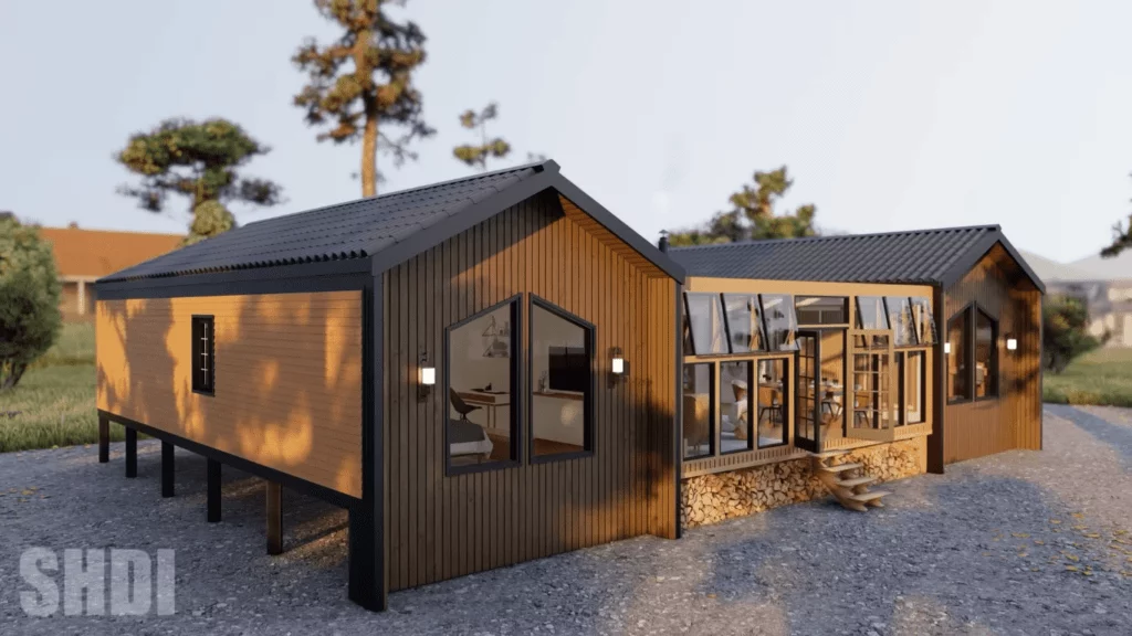 The exterior design of the Box Shipping Container House is both bold and refined. Dark wooden panels paired with a sleek black roof create a look that is modern, stylish, and instantly eye-catching. A small front staircase leads to a glass-paneled door that enhances the home’s contemporary charm while inviting abundant natural light inside, resulting in a warm and welcoming atmosphere.