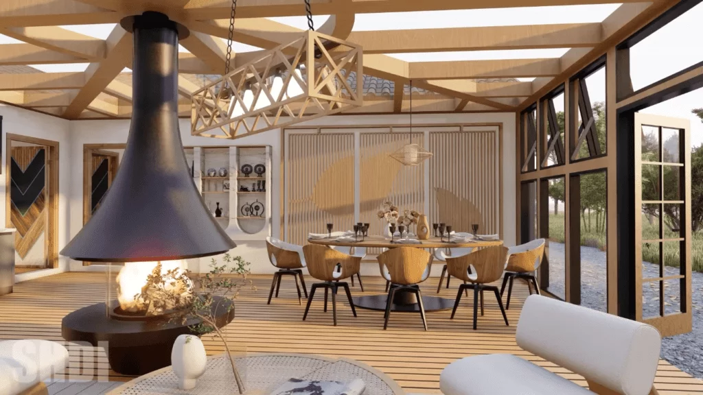 The living room serves as the warm and welcoming heart of the Box Shipping Container House.