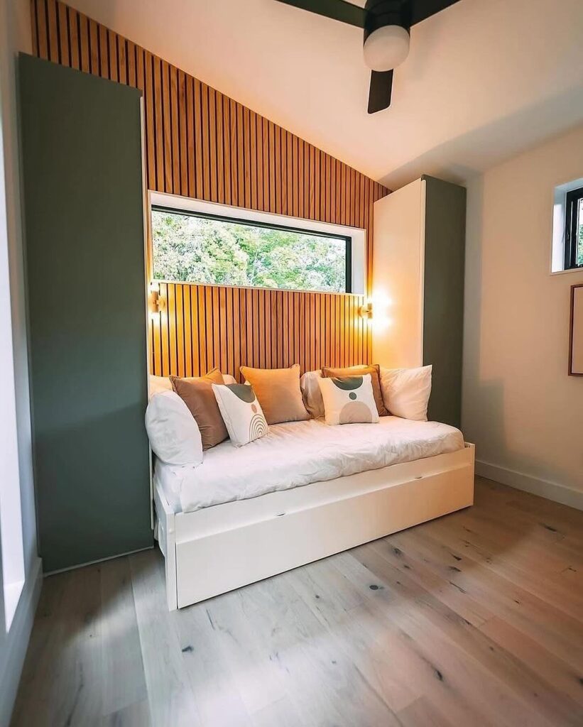 The home’s exterior showcases a beautiful mix of materials—clean white walls, warm wooden accents, and textured stonework—that create a contemporary yet inviting atmosphere. Each layer of the structure is thoughtfully designed to maximize both style and functionality.