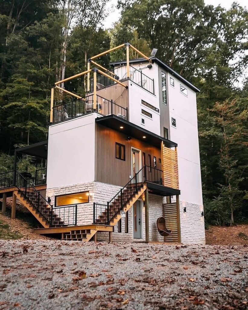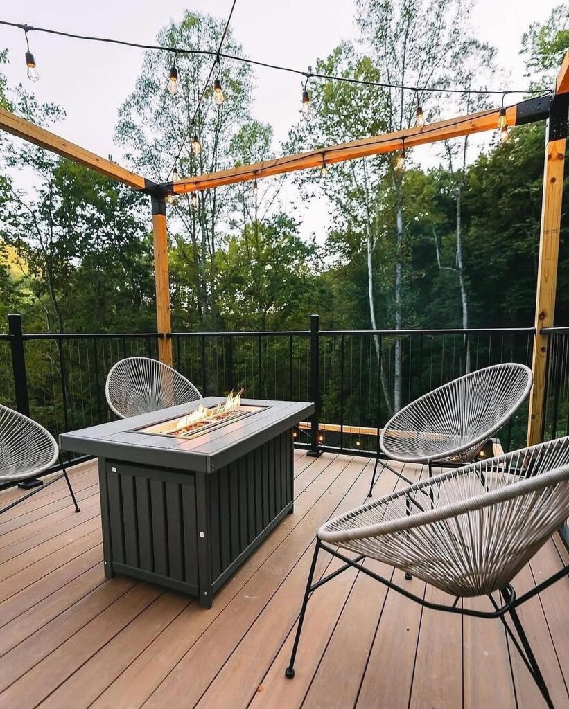 The upper decks provide breathtaking panoramic views of the surrounding forest, allowing residents to feel connected to nature while enjoying the comfort and luxury of their elevated retreat. The overhead pergola adds both charm and shade, making the space usable day and night.