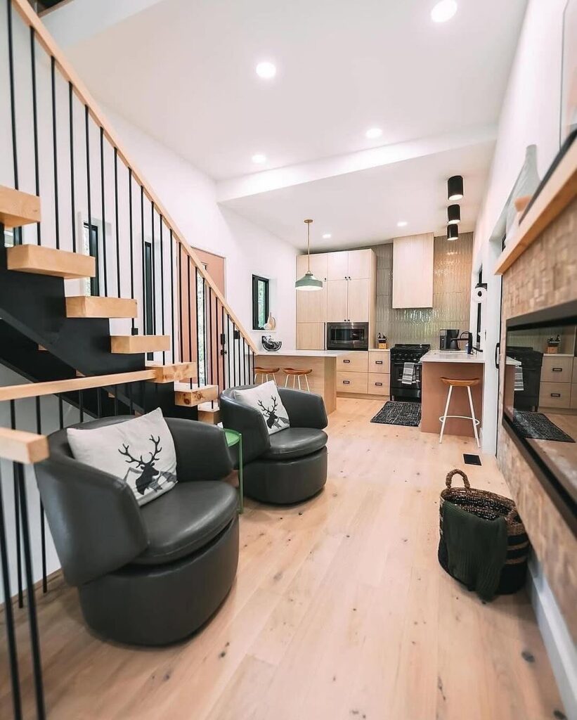 Multiple staircases elegantly frame the home, creating seamless transitions between levels. Their warm wooden steps and modern railings complement the home’s architecture while adding dynamic visual interest.