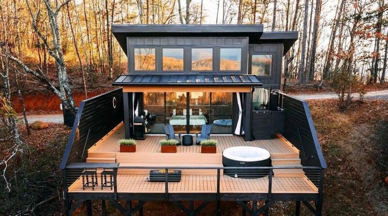 Perched gracefully above the sloping forest floor, this striking modern cabin stands as a bold blend of architectural elegance and natural beauty. Its elevated structure creates a sense of floating among the trees, offering sweeping views of the surrounding woodland and the warm glow of golden-hour light.