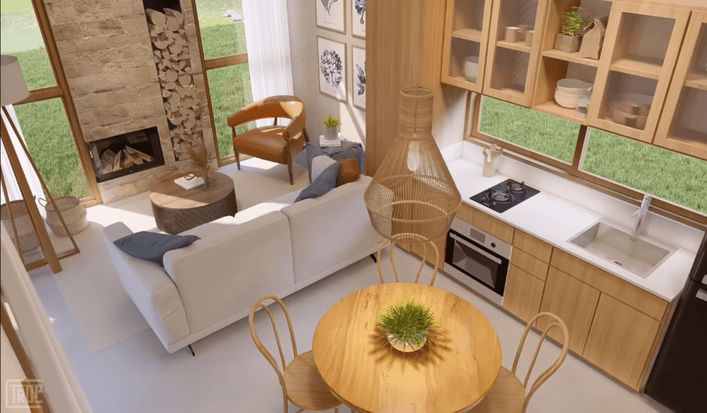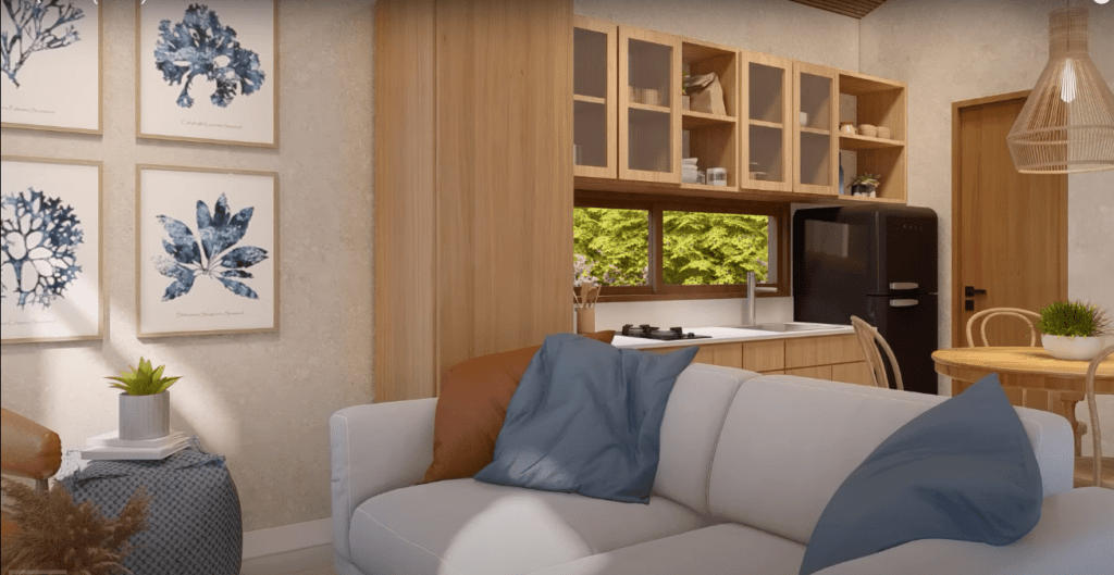 When you step inside the small house, you are greeted by a minimalist and modern main living area. Despite its compact size, the interior has been thoughtfully designed to feel open, bright, and spacious. In tiny homes, maintaining a clutter-free environment is essential, so special care is taken to avoid unnecessary items and keep the space clean, functional, and visually calm.