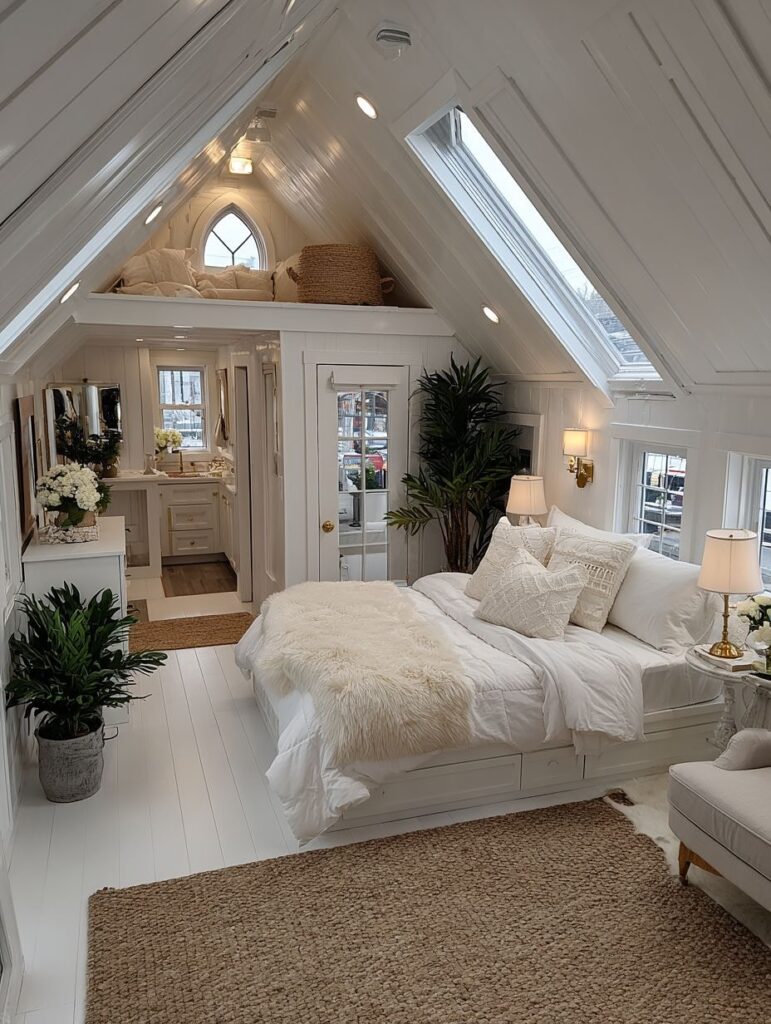 This extraordinary tiny home transforms the concept of mobile living into something grand, elegant, and unforgettable. Designed with full Victorian influence, the home features exquisite architectural detailing—from ornate trim to tall columns—that give it the presence of a miniature luxury mansion. Its crisp white exterior glows under the indoor lights of the showroom, making every detail stand out with stunning clarity.