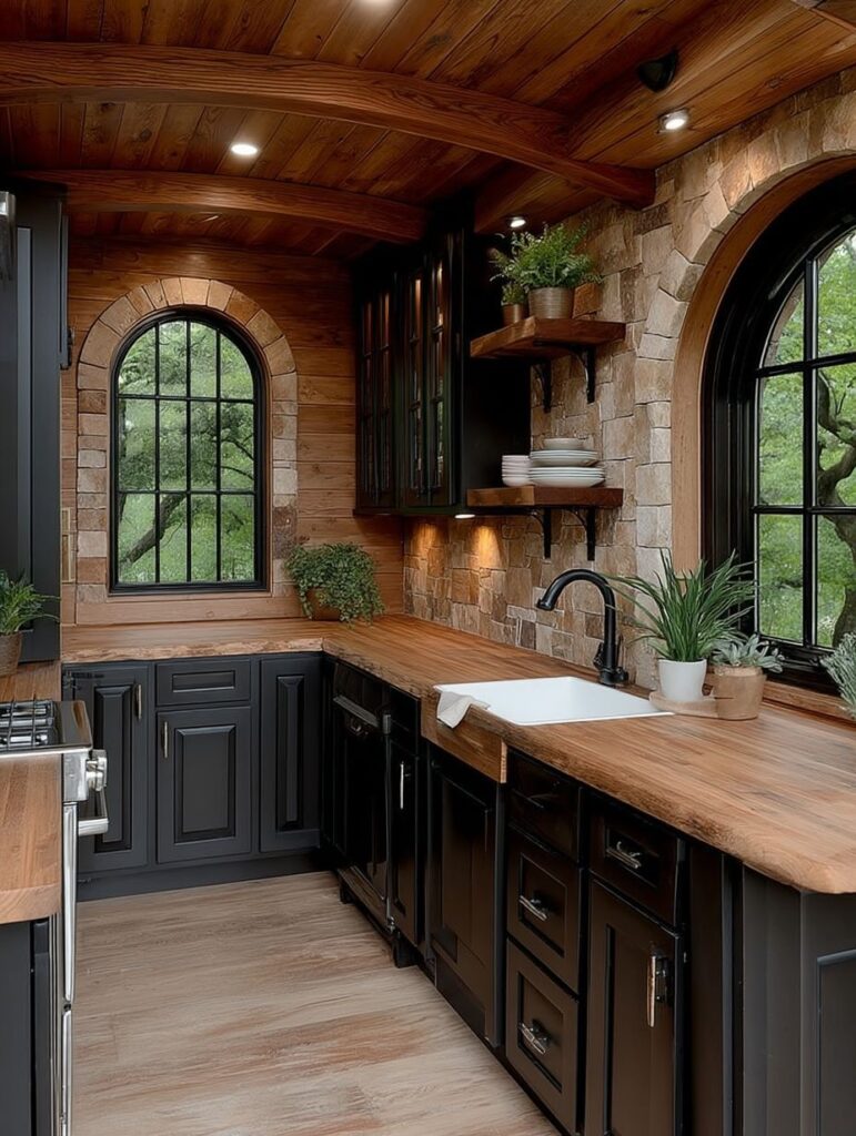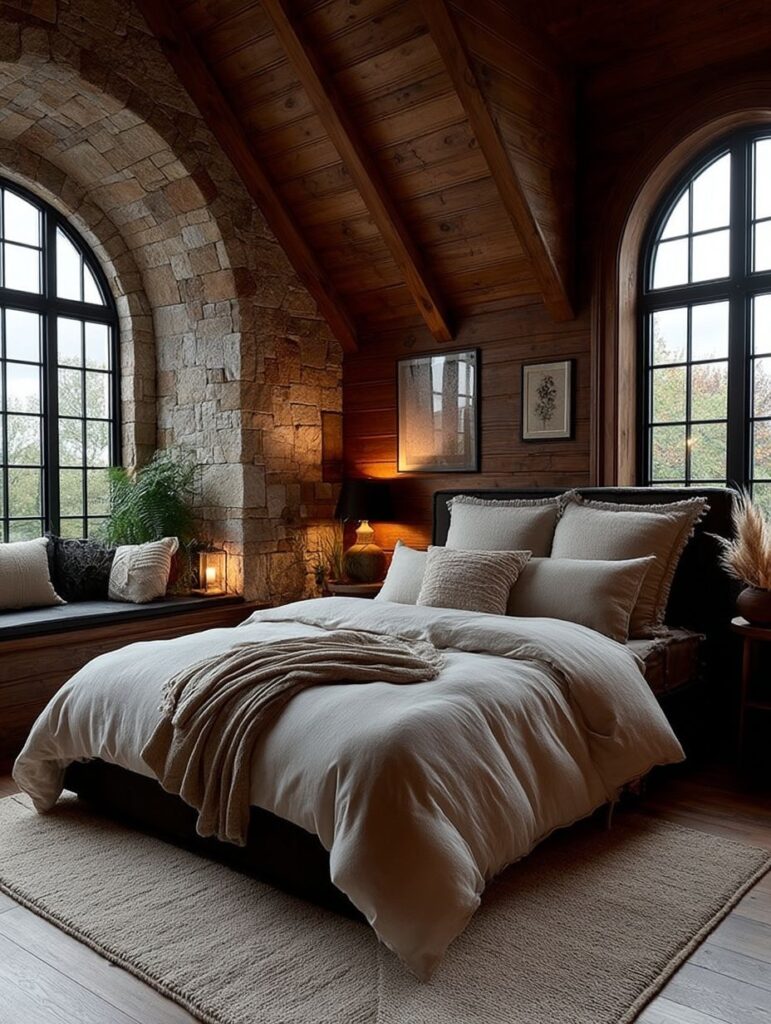 Large arched windows and wooden double doors on the main level create a warm and welcoming entrance. Soft golden light spills from inside, hinting at a cozy, intimate interior filled with natural materials and thoughtful details.