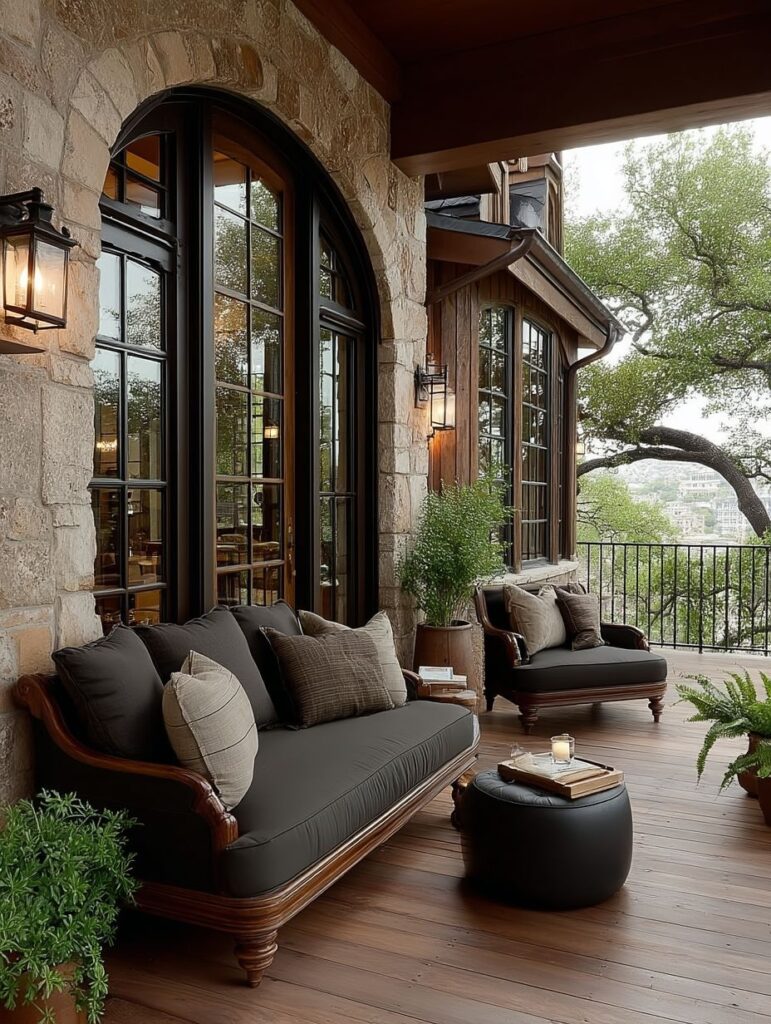 The upper balcony wraps around the home, framed by black railings and accented with inviting seating areas. From this vantage point, residents can enjoy sweeping views of the rolling hills and the surrounding oak trees, making it a perfect place to unwind.