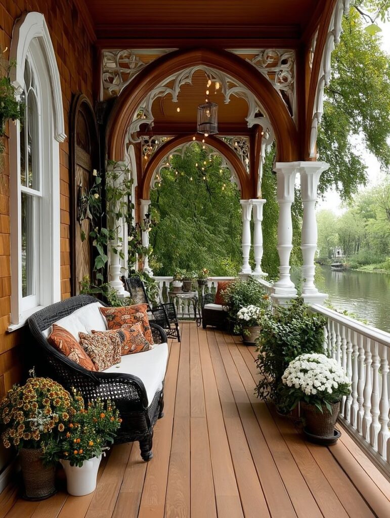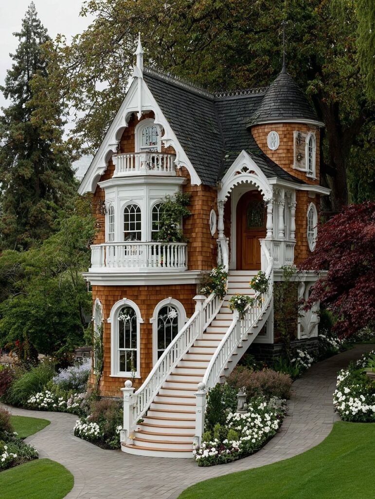On the second level, an enchanting balcony projects outward, framed by intricately carved white woodwork. This balcony, with its delicate railings and decorative edges, evokes the feeling of a tiny turret or lookout point. It appears to be the perfect spot for enjoying morning sun or listening to evening birdsong.On the second level, an enchanting balcony projects outward, framed by intricately carved white woodwork. This balcony, with its delicate railings and decorative edges, evokes the feeling of a tiny turret or lookout point. It appears to be the perfect spot for enjoying morning sun or listening to evening birdsong.