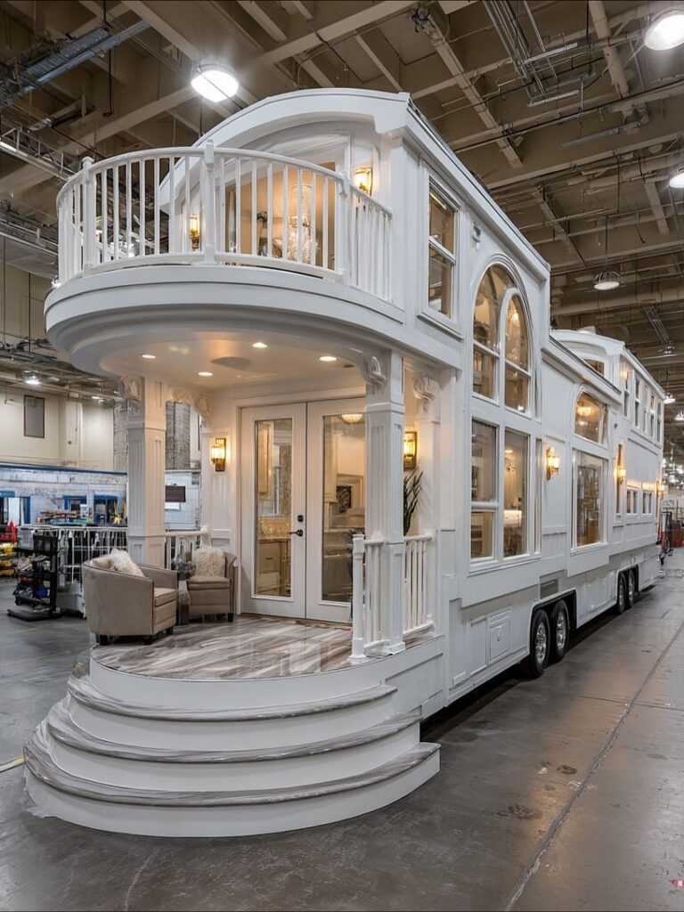 This extraordinary mobile mansion stands as a breathtaking fusion of elegance and innovation, transforming the concept of a travel home into something grand and unforgettable. With its stately white exterior and classical architectural detailing, it appears more like a miniature palace than a vehicle on wheels. Every inch reflects thoughtful design and luxury.