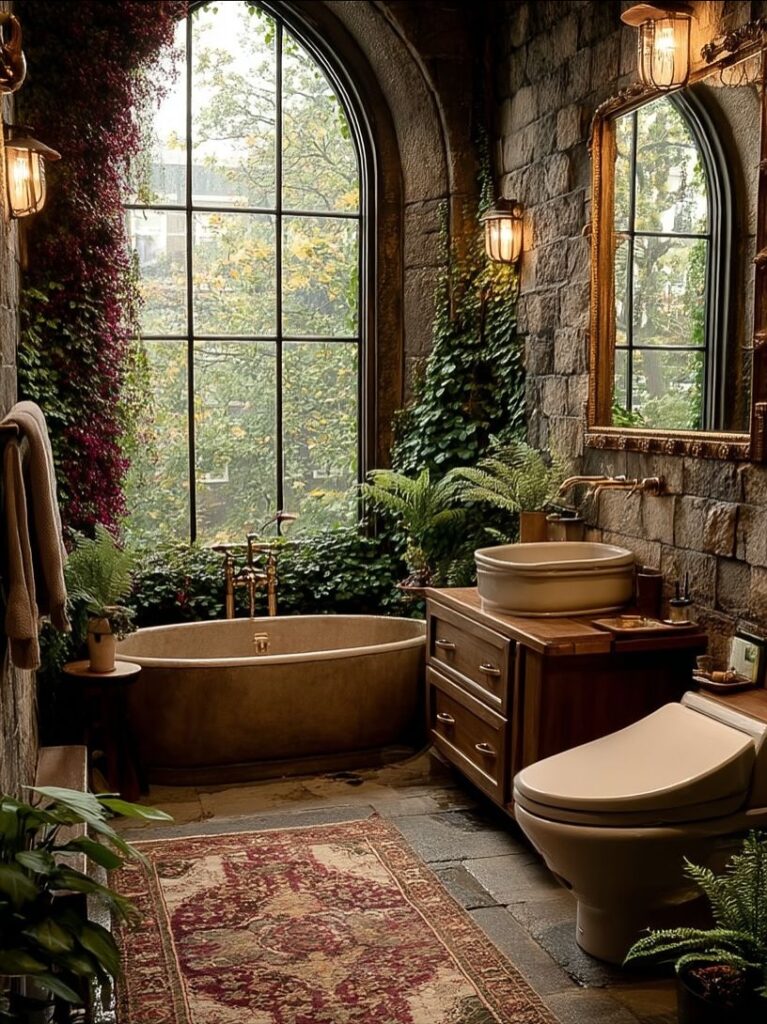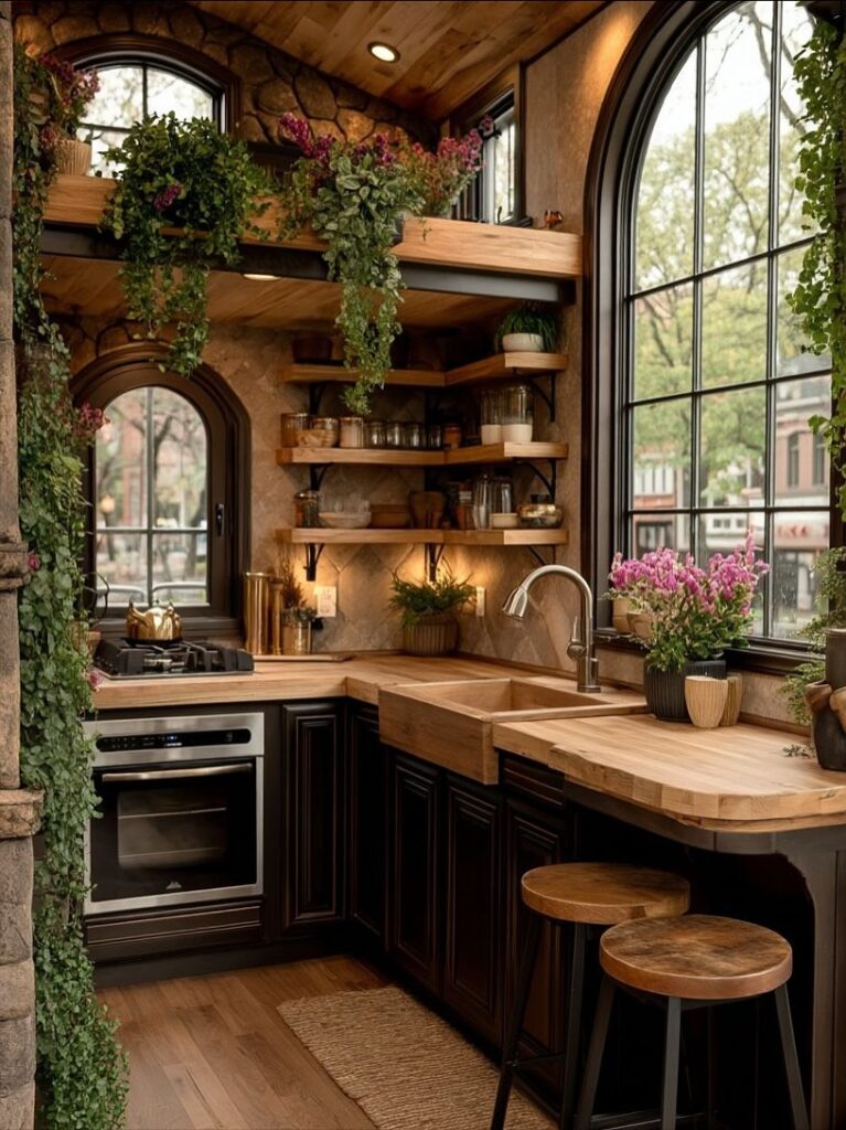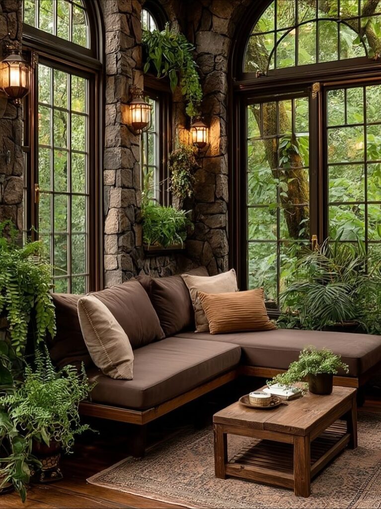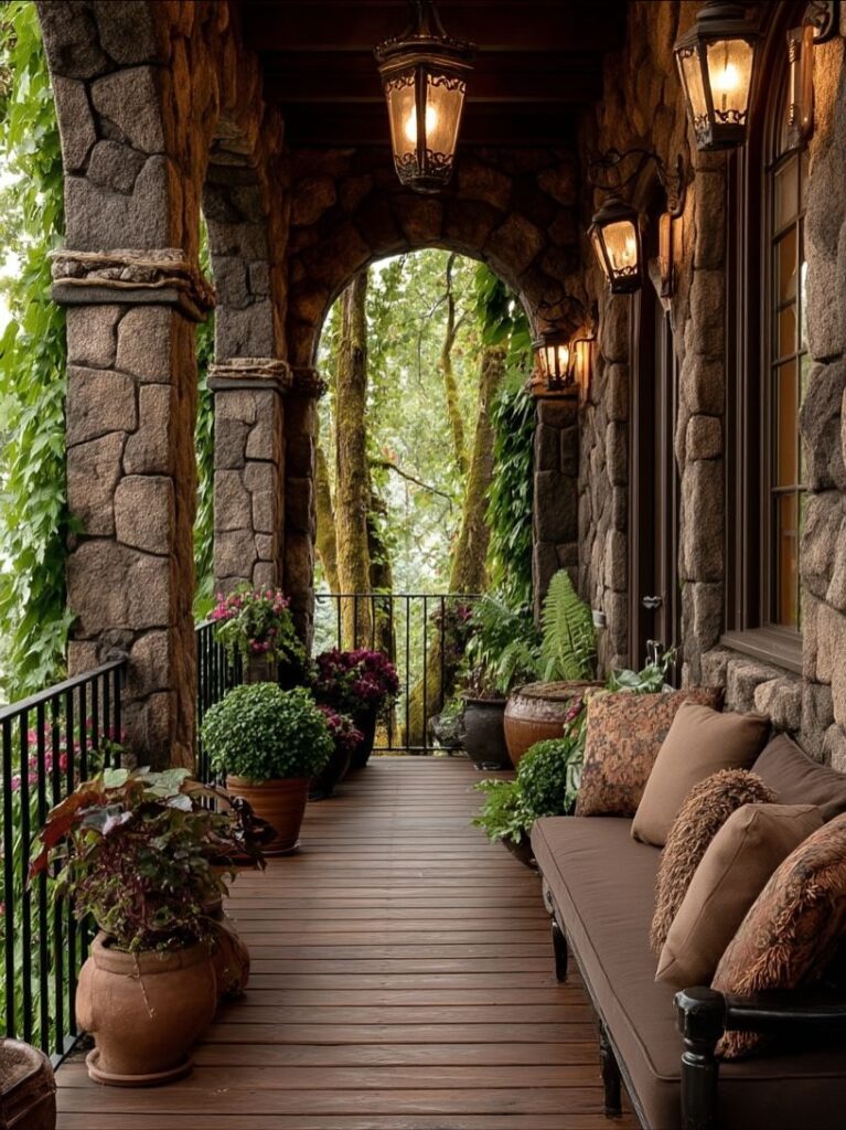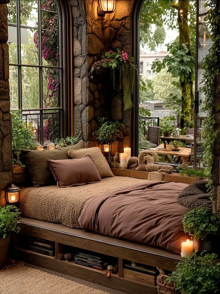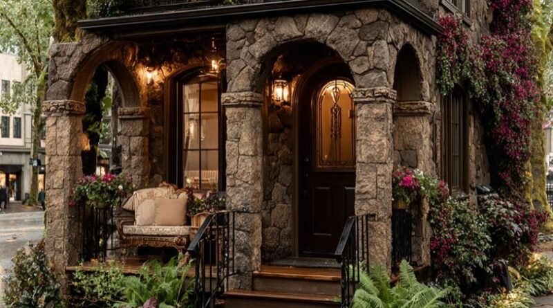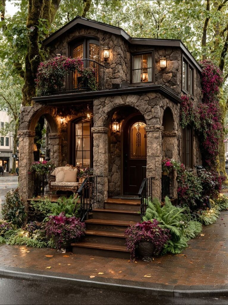 Overall, the image feels like a magical escape hidden inside the city. The combination of stone, wood, warm light, and blooming plants creates a peaceful and dreamy home that feels straight out of a fairy tale.