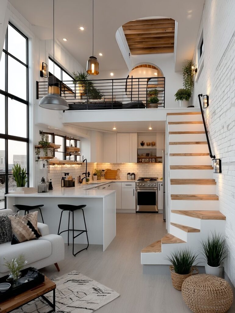 The kitchen, visible through the front windows, appears as a bright and functional space. Sleek cabinets, modern fixtures, and warm under-cabinet lighting blend practicality with style. It’s a space where cooking feels joyful and social, especially with the open layout connecting seamlessly to the rest of the home.