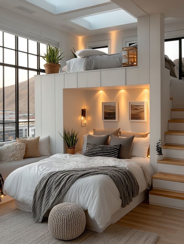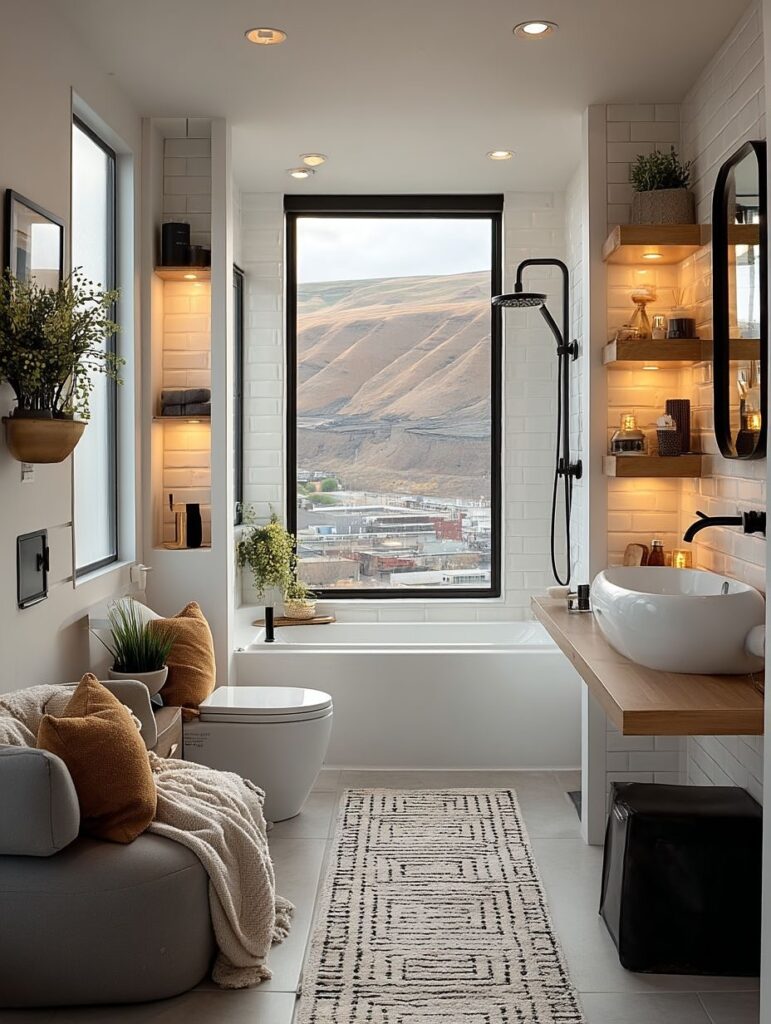 Inside, the living area is open and airy, with floor-to-ceiling windows that frame the landscape like moving artwork. Soft furnishings, warm neutral tones, and ambient lighting create a serene environment perfect for unwinding after a long day. The interior design complements the exterior’s sharp lines with a touch of softness and elegance.