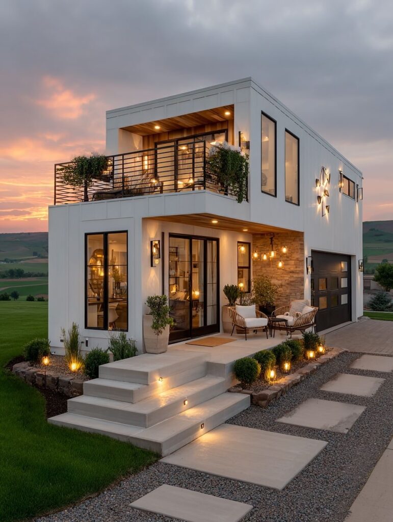 As the sun dips behind rolling hills, this modern two-story home radiates a warm, inviting glow. Its clean lines and minimalist architecture stand out against the soft evening sky, creating a perfect blend of luxury and comfort. Every exterior detail—from the illuminated steps to the symmetrical lighting—sets the tone for a home designed with intention.