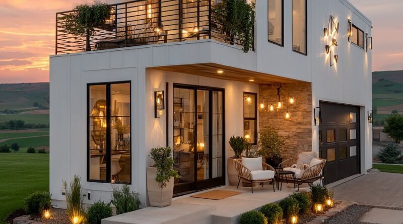 As the sun dips behind rolling hills, this modern two-story home radiates a warm, inviting glow. Its clean lines and minimalist architecture stand out against the soft evening sky, creating a perfect blend of luxury and comfort. Every exterior detail—from the illuminated steps to the symmetrical lighting—sets the tone for a home designed with intention.