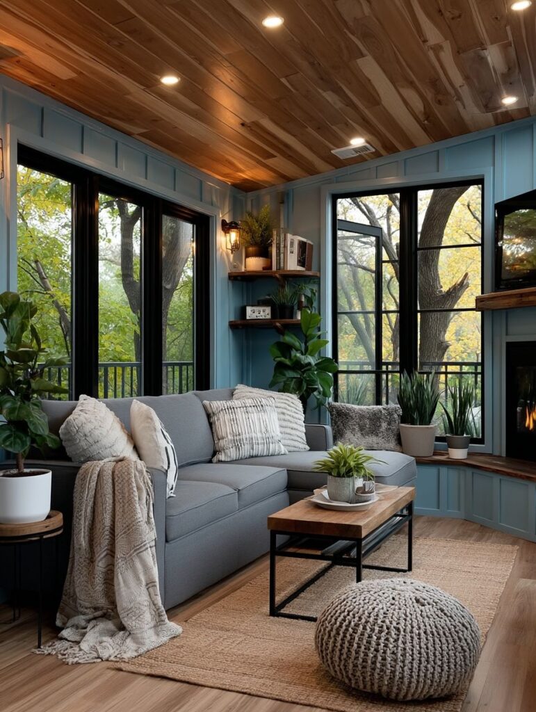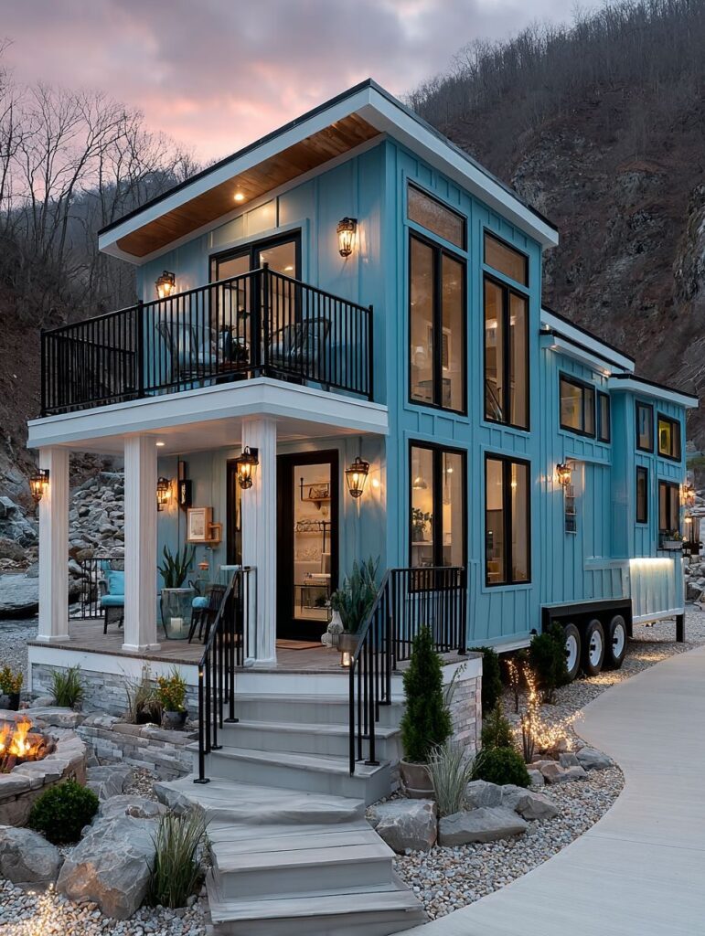 This charming blue tiny home sits peacefully among rocky hills, glowing softly as the sky fades into evening. Warm lantern lights frame the doors and windows, while the small balcony and white porch columns add a gentle, welcoming touch.