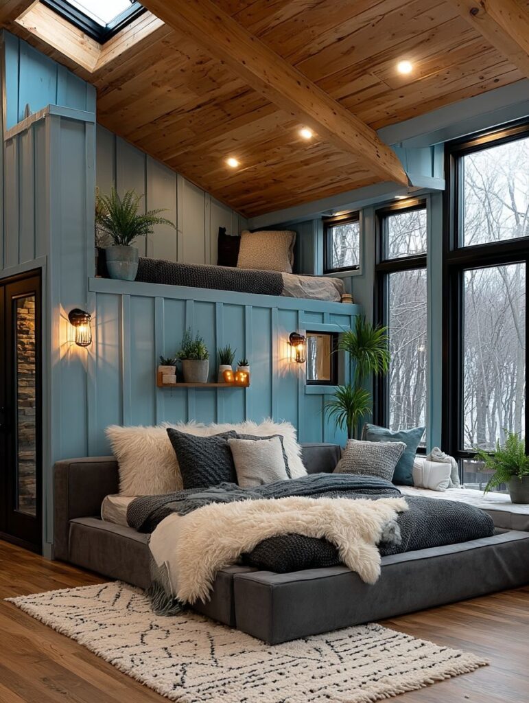 The sleeping loft inside is tucked above the main floor, with a comfortable mattress, soft blankets, and gentle reading lights. The low ceiling and small windows create a snug, safe feeling, perfect for quiet nights and restful sleep.