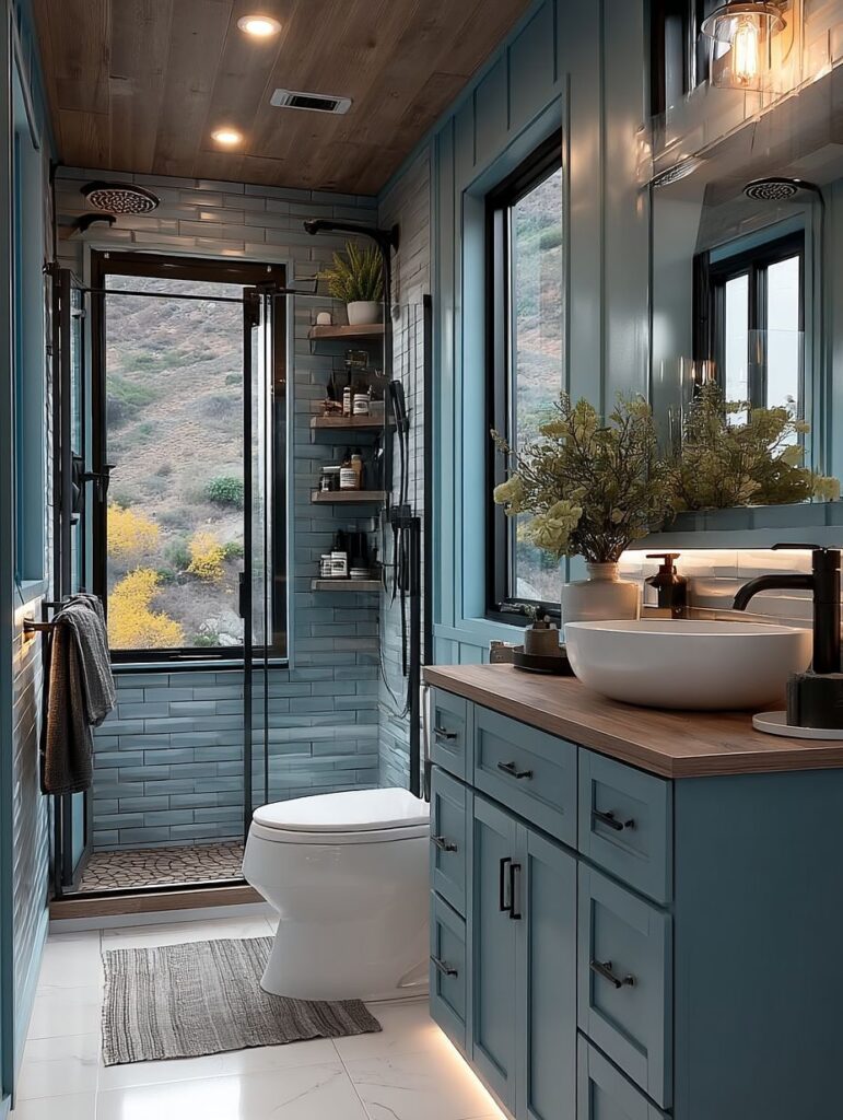 The bathroom inside is modern and clean, with a glass shower, simple vanity, and neatly placed shelves for towels and essentials. Soft lighting and small plants give the room a calm, spa-like feel despite its compact size.