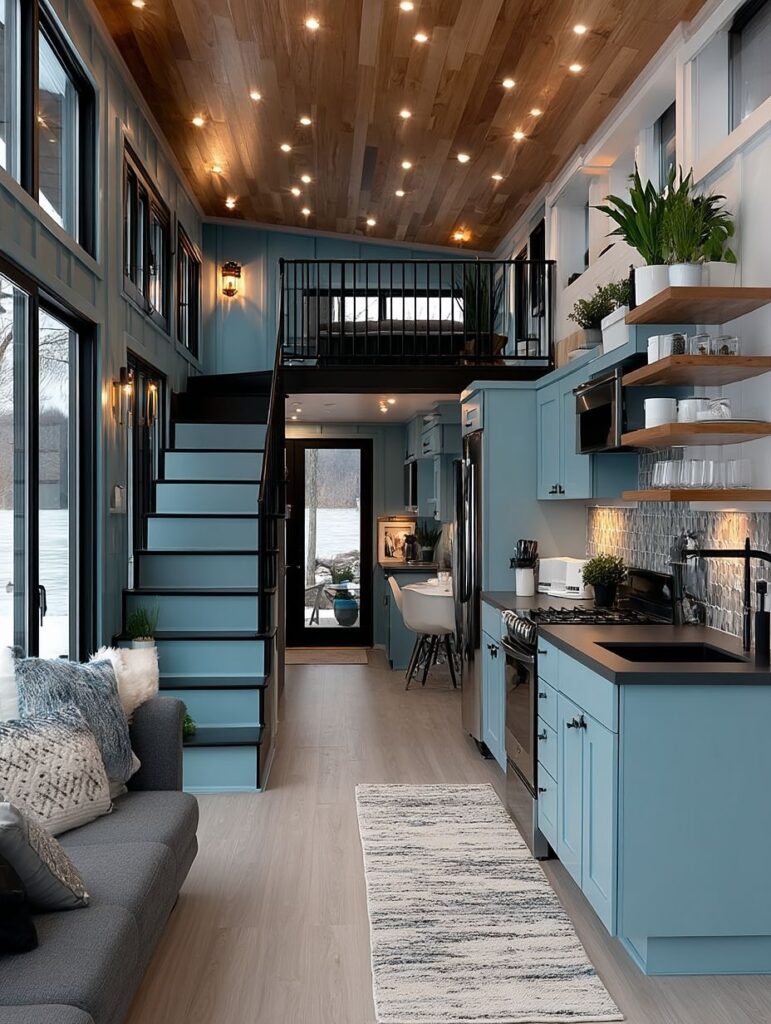 The kitchen inside is compact but beautifully designed, featuring white cabinets, open wooden shelves, and warm under-cabinet lighting. A tiny dining nook sits beside the window, where simple meals feel peaceful and special.