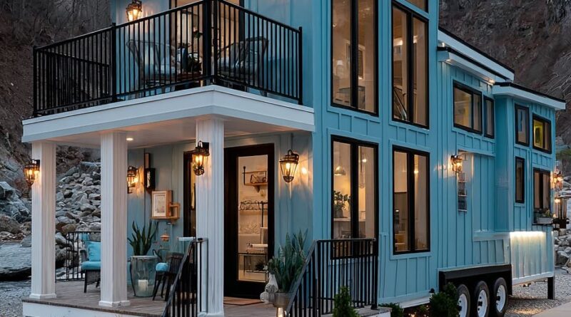 This charming blue tiny home sits peacefully among rocky hills, glowing softly as the sky fades into evening. Warm lantern lights frame the doors and windows, while the small balcony and white porch columns add a gentle, welcoming touch.
