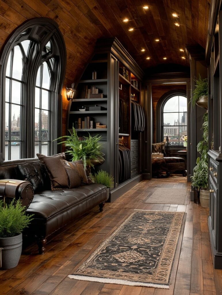 A small indoor reading nook sits near one of the arched windows, with a comfortable armchair, a floor lamp, and shelves filled with well-loved books. From here, the outside world feels far away, replaced by silence, warmth, and the steady rhythm of mountain life.