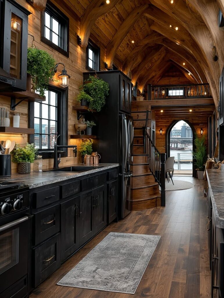 The kitchen inside is both rustic and modern, featuring dark wooden cabinets, open shelving, and a wide farmhouse sink. Warm pendant lights hang over a sturdy island where fresh bread, fruit bowls, and steaming mugs of coffee create a feeling of simple mountain comfort.