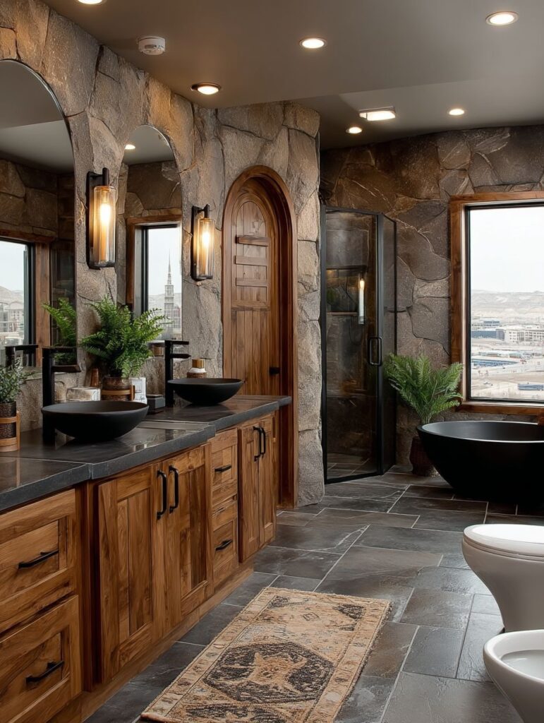 Inside the main bathroom, smooth stone tiles line the walls, and a deep soaking tub rests beneath a small window. Soft towels, gentle candlelight, and the faint sound of wind outside create a quiet, spa-like atmosphere.