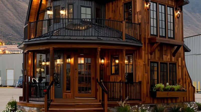 Nestled against a backdrop of rugged mountains, this warm wooden home glows like a lantern at dusk, with soft golden lights shining through large windows and welcoming balconies. The curved pathway leading to the porch feels like a gentle invitation to step into a peaceful mountain retreat.