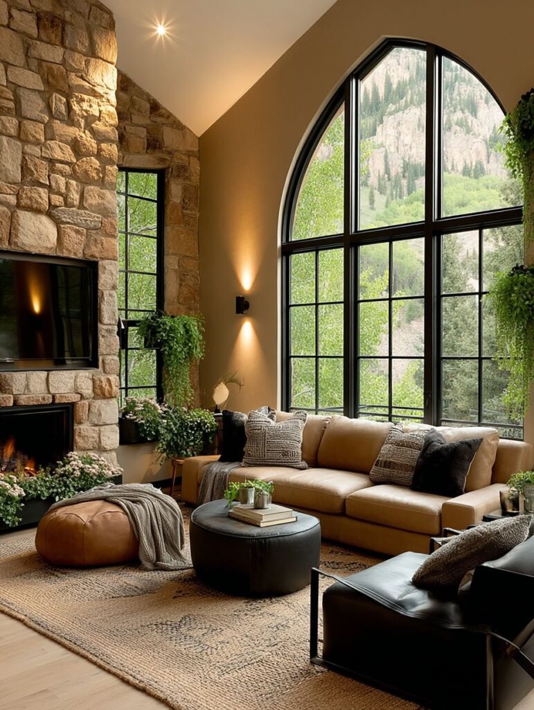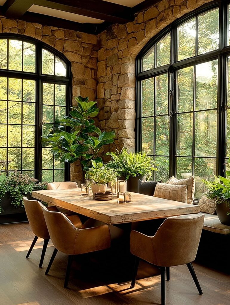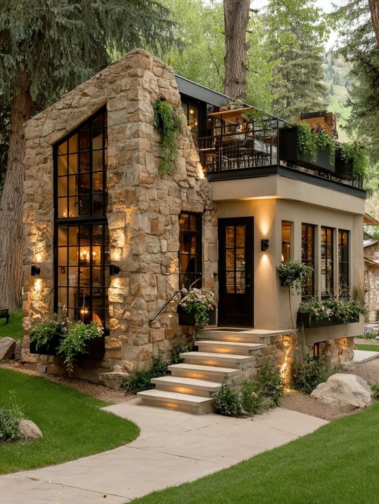This beautiful stone house sits quietly among tall trees, with warm golden lights glowing through the tall glass windows and soft greenery hanging from the walls. The stone texture gives the home a strong, natural beauty that blends perfectly with the forest.