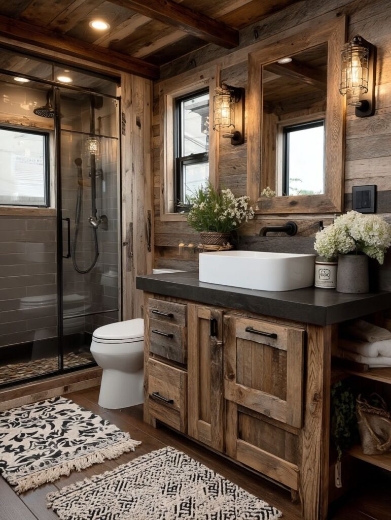 The bathroom inside is designed like a spa, with natural stone tiles, a deep soaking tub, and wooden accents that match the rest of the home. Towels are neatly folded, and soft candlelight creates a relaxing and private atmosphere.