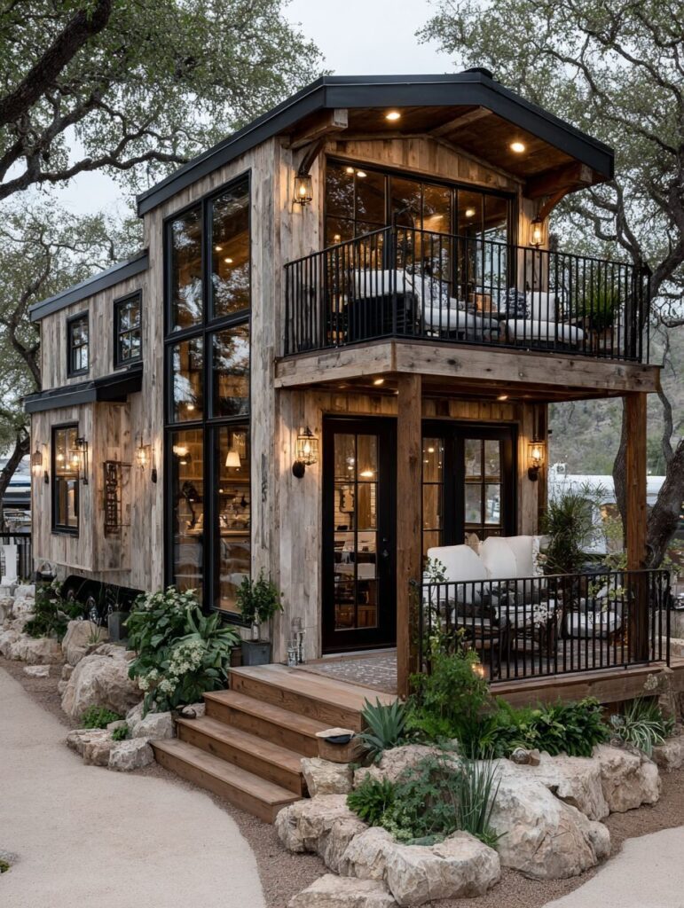 This beautiful wooden home stands quietly among twisting oak trees, its weathered timber walls and tall glass windows glowing with soft golden light. The small front porch and stone-lined path create a welcoming feeling, as if the house is gently inviting visitors to slow down and breathe.