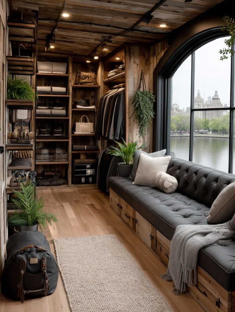 Inside the home, the living area feels warm and intimate, with exposed wooden beams, soft amber lamps, and a comfortable sofa placed near the tall windows. A textured rug lies underfoot, and shelves filled with pottery and books give the space a calm, lived-in charm.