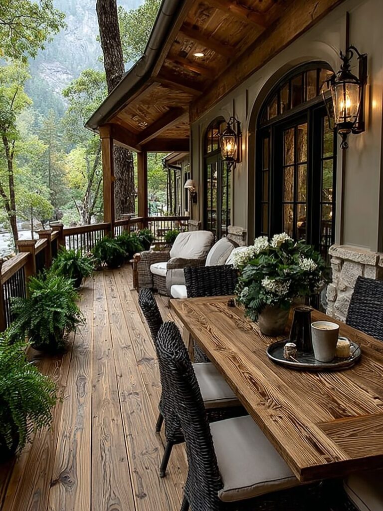 The slate-tiled roof adds a timeless elegance, giving the cottage a traditional yet refined character. Paired with the light-toned walls and rich wooden accents, the exterior blends seamlessly with the natural landscape. The gated entry, complete with ornate metalwork, hints at both privacy and sophistication, making the entire property feel like a secluded getaway.