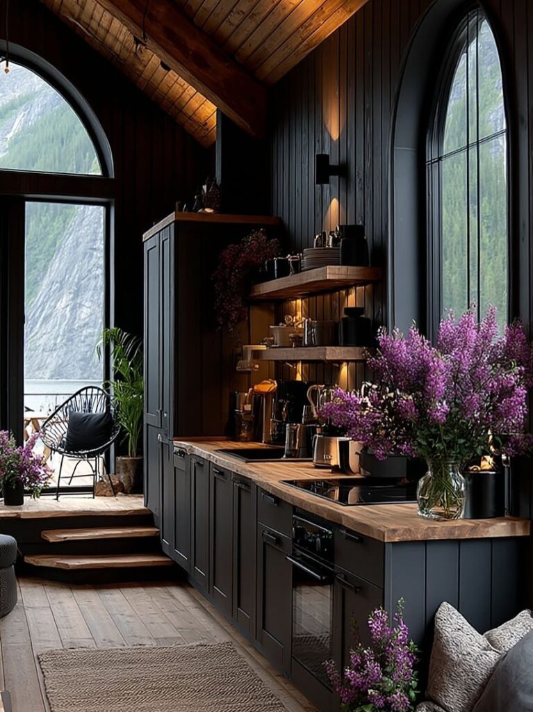 The kitchen, visible from the front windows, showcases a thoughtful layout that balances efficiency with elegance. Sleek countertops, open shelving, and warm lighting make it both functional and inviting. Whether cooking a quiet dinner or sharing a meal with company, the space feels like the heart of the home.