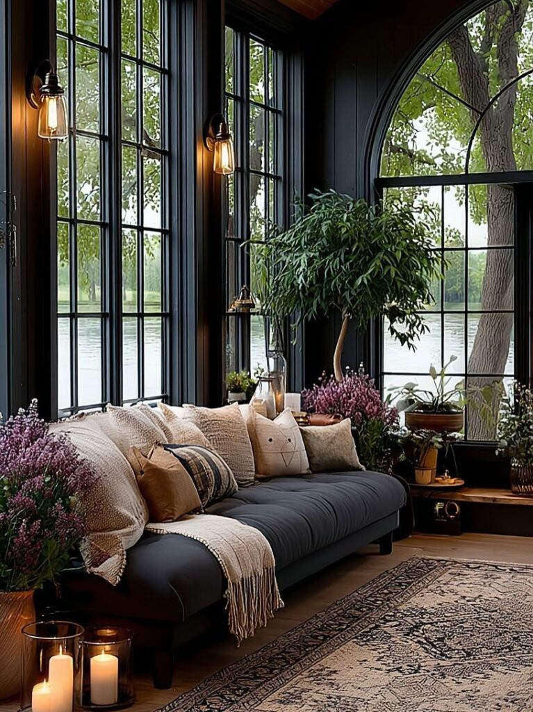 Toward the back of the home lies a cozy seating nook where one can unwind while gazing out at the surrounding greenery. This intimate space, paired with the soft glow of ambient lighting in the evenings, completes the home’s atmosphere of modern serenity. Both inside and out, this retreat stands as a beautiful reminder that thoughtful design can transform even a small structure into a luxurious escape.