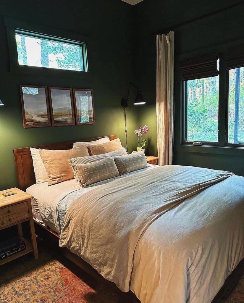 Inside, the cabin would feel like a warm embrace—wooden walls, beams, and floors coming together to create a space rich with rustic charm. The soft glow of lamps would illuminate cozy corners filled with blankets, books, and small personal treasures. Every part of the interior would feel intentionally designed to bring peace after long days wandering through the woods.