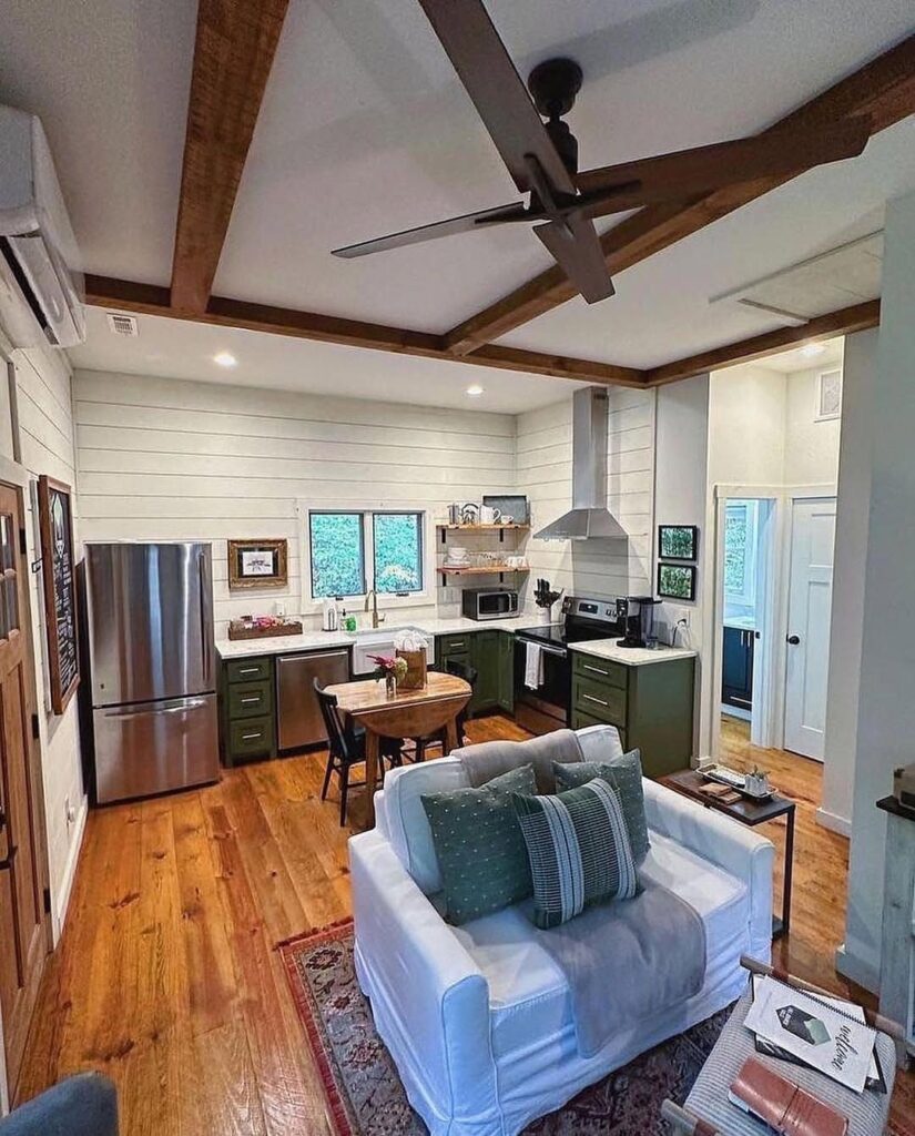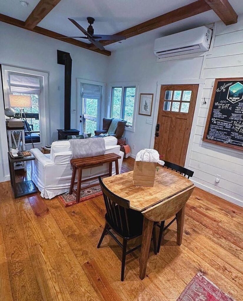 A small kitchen inside would likely feature wooden countertops, open shelves lined with mugs, and a stove waiting to be used for simple, comforting meals. The scent of coffee brewing or soup simmering would mix naturally with the woodsy aroma drifting in through open windows. It’s the kind of kitchen where every morning feels slow and grounding.