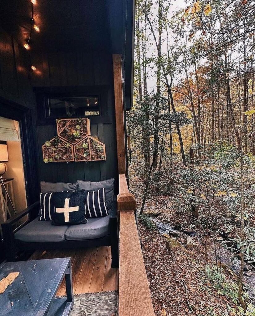 As evening settles, the cabin transforms into a glowing haven among the trees. The string lights outside flicker softly, the fireplace warms the surrounding chairs, and the forest grows quiet. This little home stands not just as a shelter but as a reminder that peace can always be found in the simplest places—deep in the woods, under autumn leaves, in a cabin built for slowing down and breathing deeply.