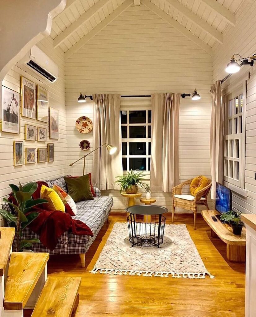Stepping inside, the home offers the same warmth and charm found on the exterior. The interior features soft lighting, wooden accents, and comfortable furnishings that create a welcoming, cabin-like ambiance. The living area is thoughtfully arranged, with cozy seating placed near the windows, allowing natural light to fill the space during the day.
