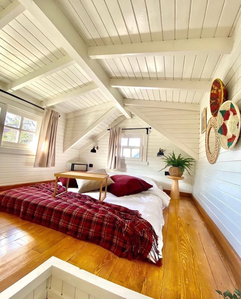 The bedroom continues the home’s theme of comfort and simplicity. With soft linens, warm lighting, and a window overlooking the peaceful yard, it becomes a restful sanctuary. The gentle glow from the outdoor lanterns can often be seen through the curtains, adding to the room’s calming nighttime atmosphere.