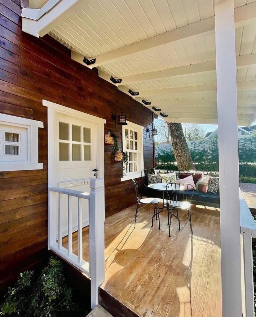 The front porch, framed with elegant white railings, welcomes visitors with a simple yet cozy sitting area. Here, mornings can begin with a quiet cup of coffee, while evenings offer a perfect spot to unwind and listen to the soft hum of outdoor lanterns. The gravel path curves gracefully through the yard, adding character and leading the eye toward the cottage’s inviting entrance.