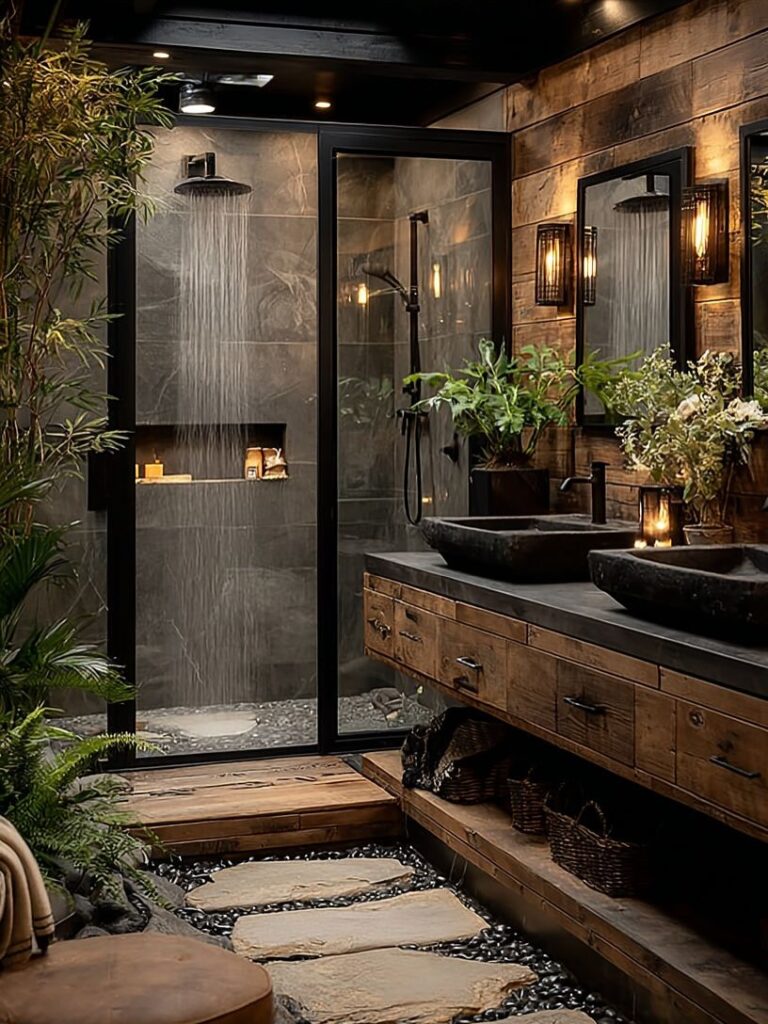 Nestled beneath the sweeping branches of tall, graceful trees, this striking black cottage stands like a modern fairytale retreat in the heart of nature. Its dark exterior contrasts beautifully with the surrounding greenery and vibrant flowers, creating a dramatic yet inviting presence. Warm lantern lights glow against the matte walls, giving the home a cozy, enchanting charm that draws the eye instantly.