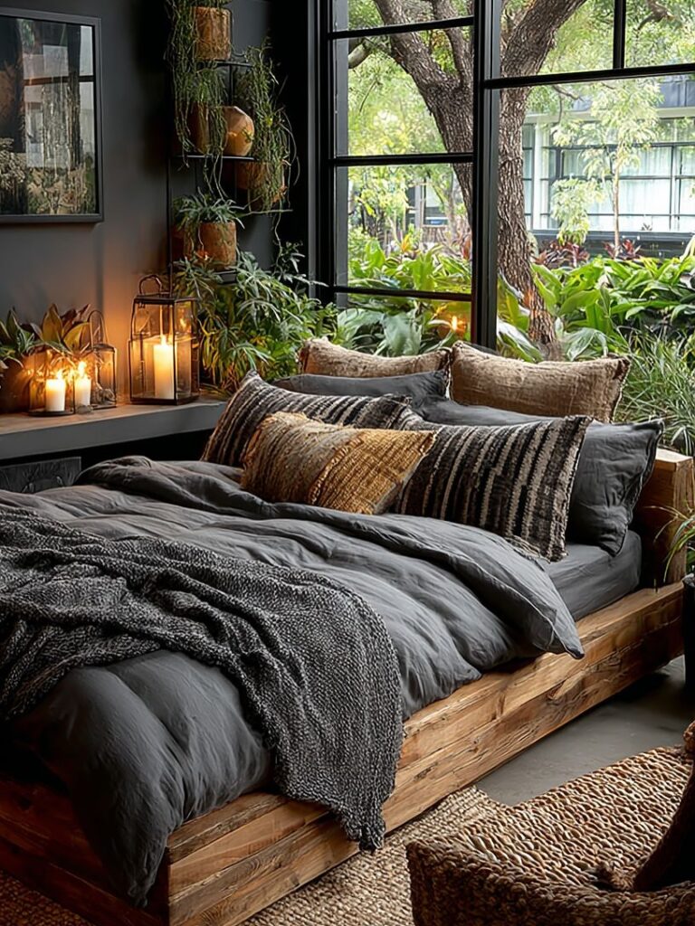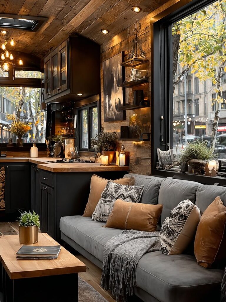 Inside, the cottage continues its blend of modern elegance and natural comfort. The living area features warm wooden furnishings, soft lighting, and large windows framed in black that let in generous amounts of daylight. The interior decor mirrors the exterior aesthetic—minimalist yet expressive, with deep tones balanced by cozy textiles and carefully chosen decor pieces.