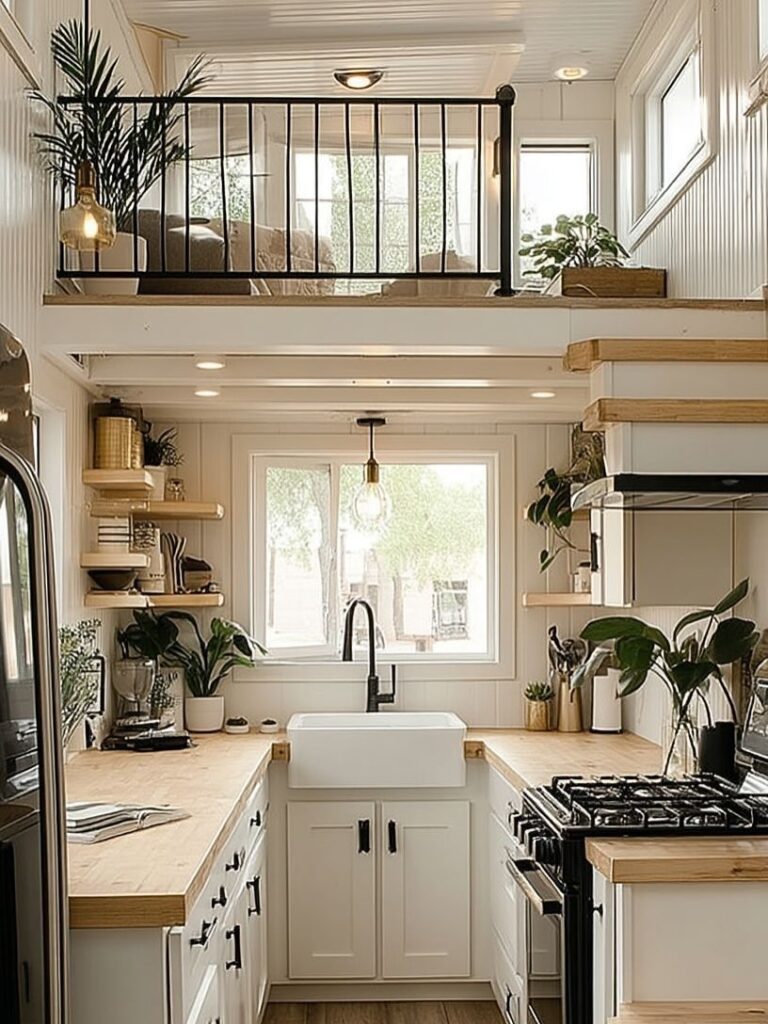 The kitchen, visible through the windows, appears inviting and practical. Light cabinetry, open shelving, and modern fixtures give it a clean, stylish aesthetic. It’s easy to imagine cooking here—sunlight streaming through the windows, plants on the counter, and soft music playing in the background. Despite its size, the kitchen seems designed to make daily living feel effortless, charming, and organized.