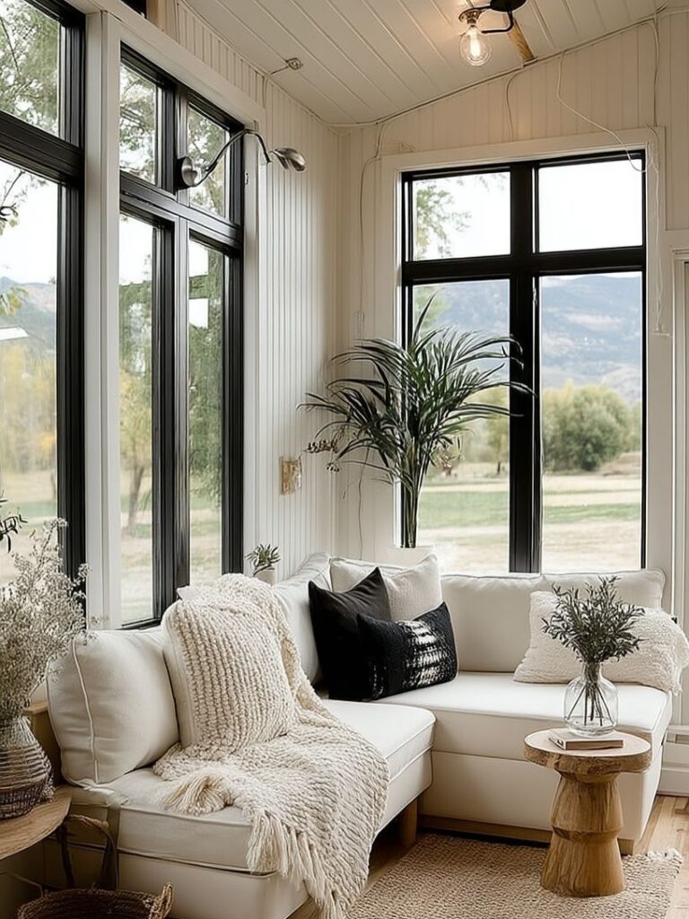 Inside, the home feels surprisingly spacious thanks to the large windows that flood the rooms with natural light. The white walls and cabinetry create a bright, airy atmosphere, while wooden accents add a touch of warmth. The main living area flows easily from the kitchen to a small lounge space, where plants and decor pieces add personality without overwhelming the room. The thoughtful layout makes every corner feel intentional and useful.