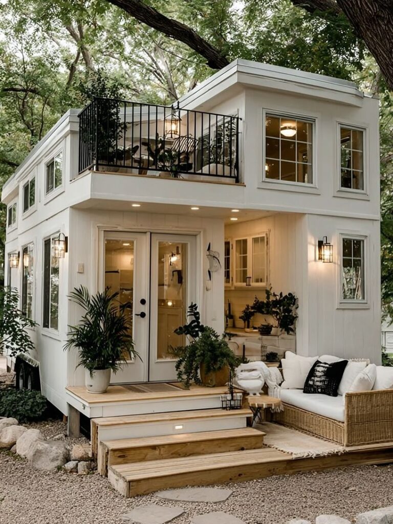 Tucked beneath the shade of towering trees, this modern tiny home stands as a perfect example of how thoughtful design can transform even the smallest spaces into something extraordinary. Its crisp white exterior, clean lines, and warm lighting make it feel welcoming from the very first glance. Every detail—from the black-framed windows to the cozy outdoor seating—suggests a home built for comfort, calm, and effortless style.