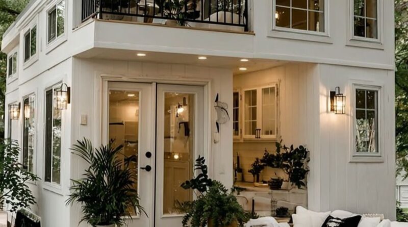 Tucked beneath the shade of towering trees, this modern tiny home stands as a perfect example of how thoughtful design can transform even the smallest spaces into something extraordinary. Its crisp white exterior, clean lines, and warm lighting make it feel welcoming from the very first glance. Every detail—from the black-framed windows to the cozy outdoor seating—suggests a home built for comfort, calm, and effortless style.