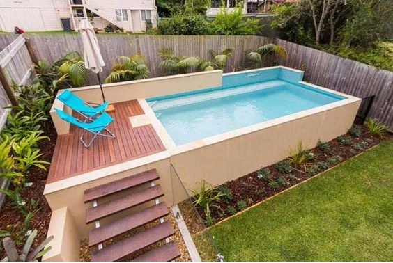 Although this example showcases a compact pool size, the same design can be scaled up by using a larger container to suit bigger backyards or expanded layouts. A sturdy two-step exterior ladder is positioned along the foundation, making it effortless for swimmers to reach the edge and transition into the water.