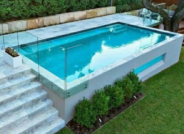 This design is one of the most stylish above-ground container pools you’ll find. The interior is finished in a sleek dark brown, giving the water a rich, luxurious look. Built-in steps make it easy to enter the pool, while a sturdy ladder on the outside ensures safe access.