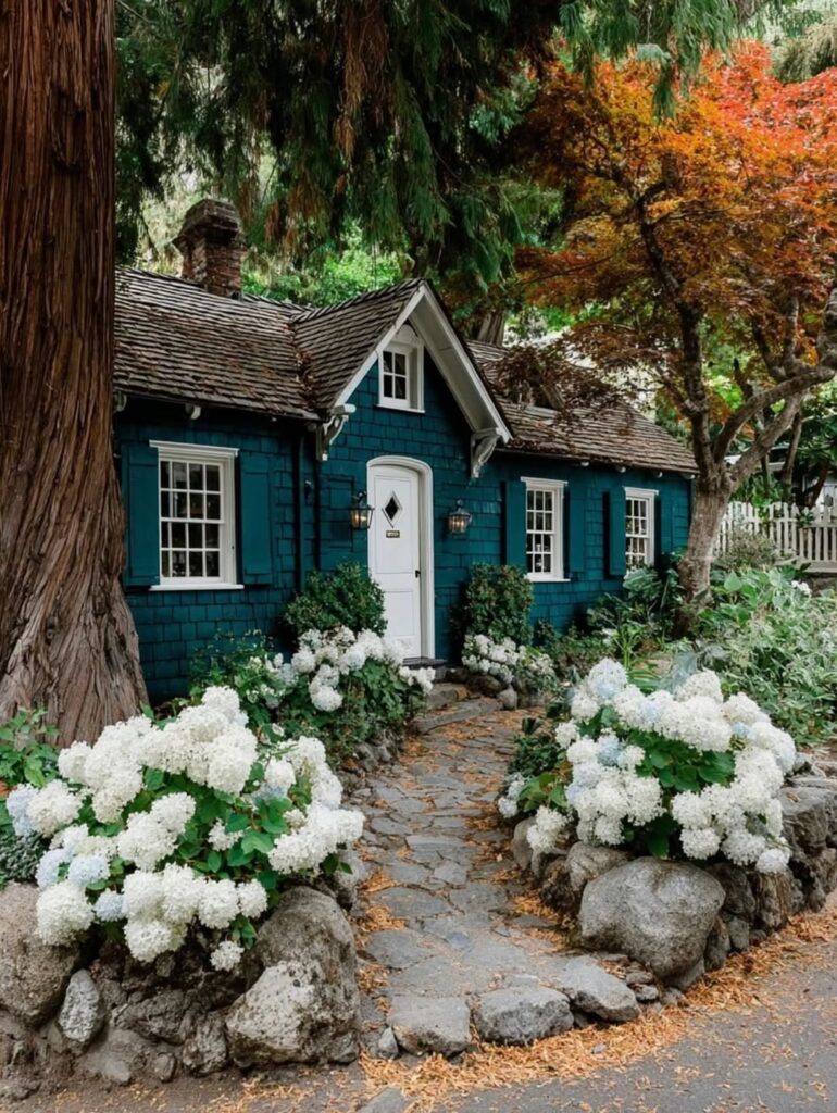 A teal-blue cottage with white hydrangeas lining the path feels like a gentle haven. It exudes coziness with its low roofline, rustic shingles, and welcoming door. The flowering entrance creates a calming transition from outside to inside, like stepping into a cherished memory.